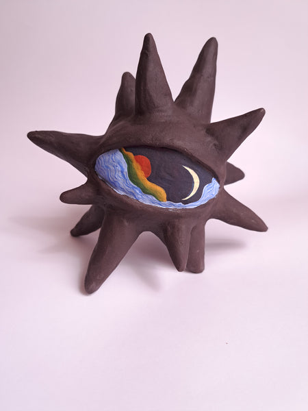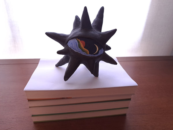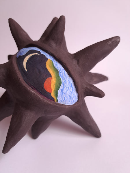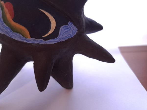 Escultura em cerâmica (argila preta) e esmalte de alta temperatura, tinta guache