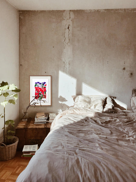Módulos de MDF com tinta Flash verde, roxa e vermelha em borracha microporosa sobre papel
